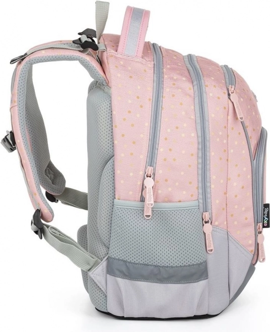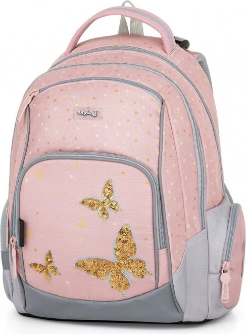 Šolski nahrbtnik OXY GO v nežnem dizajnu z motivom metuljev navduši tako z videzom kot premišljeno ergonomijo. Zahvaljujoč zračnemu hrbtišču in nastavljivim naramnicam nudi udobje pri celodnevnem nošenju ter podpira pravilno držo telesa. Nizka masa 0,99 kg in odsevni elementi povečujejo varnost na poti v šolo.