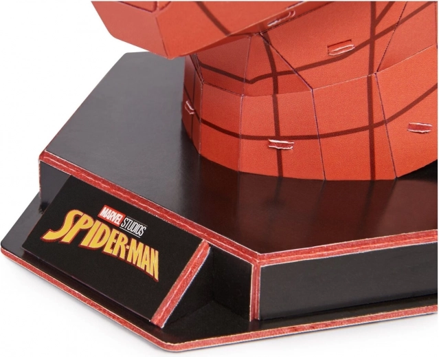 Model ujame ikonično masko z vzorcem pajčevine in izrazitimi belimi očmi. Priložen je stabilen podstavek z logotipom MARVEL SPIDER-MAN za elegantno razstavljenje.