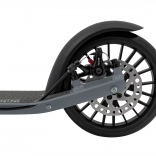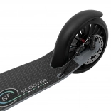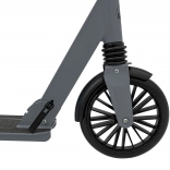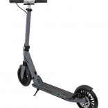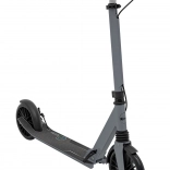 Za varnost je skiro opremljen z dvojnim zavornim sistemom – ročna kolutna zavora zadaj in nožna zavora na blatniku. Tristopenjska višinska nastavitev krmila (85–99 cm) se prilagodi voznikom različnih višin, ergonomski gumijasti ročaji pa nudijo udobje tudi na daljših razdaljah.