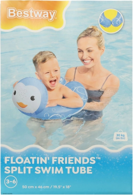 Uživajte v vodnih radostih z otroškim napihljivim obročem BESTWAY v obliki pingvina. Igriv dizajn, prijetna modra barva in mehurčast motiv spodbujajo otroke k varnemu spoznavanju z vodo in učenju plavanja. Obroč je izdelan iz trpežnega PVC in je namenjen otrokom, starim 3–6 let (maks. 30 kg).