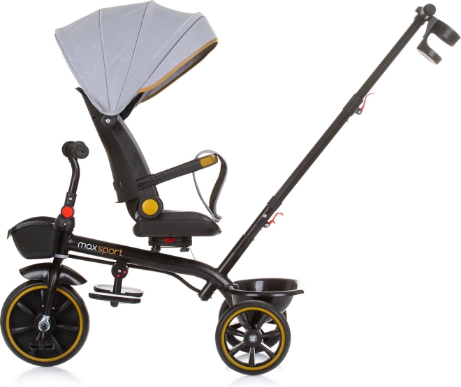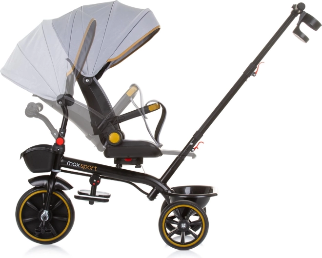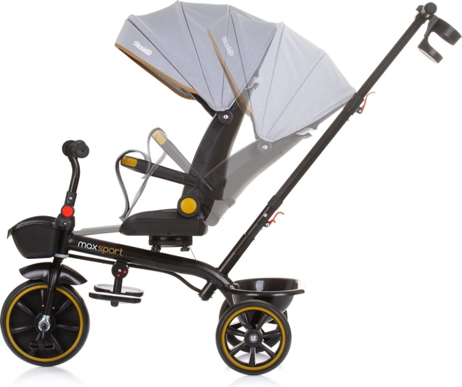 Tricikel Chipolino Max Sport 2v1 je zasnovan za največje udobje in varnost. Zahvaljujoč vrtljivemu sedežu 360° lahko otroka vozite v smeri ali proti smeri vožnje, ko pa je pripravljen, zlahka preide na samostojno vožnjo s pedali. Širok, mehko oblazinjen sedež z 2 položajema naklona, varnostni pasovi in odstranljiv varnostni lok zagotavljajo udobje in zanesljivost.