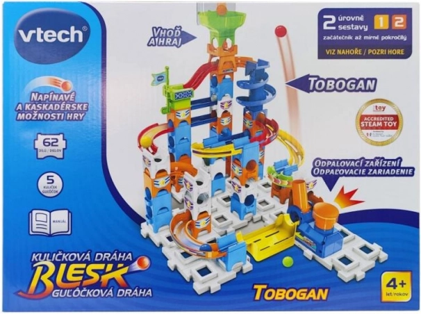 Kroglična steza Blisk bo vsak dan spremenila v razburljive dirke. S pisanimi kosi, spiralami in lijaki si bodo otroci postavili dinamične proge, po katerih kroglice drvijo kot po toboganu. Gradbena igra spodbuja ustvarjalnost, logiko in fino motoriko.