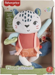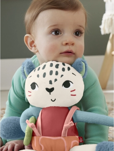 Plišasta panterka FISHER-PRICE Planet Friends je zasnovana za nežno senzorično stimulacijo najmlajših. Kontrastni vzorci pritegnejo pozornost, mehke teksture in ušeska spodbujajo raziskovanje z dotikom, šumeči »čevljički« pa vabijo k stiskanju in poslušanju. Dolge nogice, trakovi in drsni obroček motivirajo otroke k prijemanju, vlečenju in vadbi fine motorike.