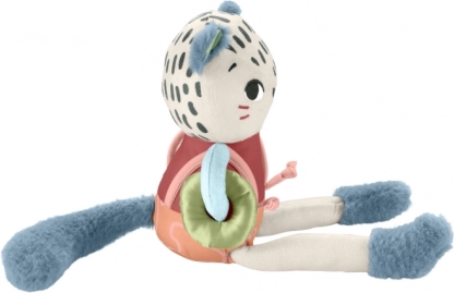 Kontrastni elementi pritegnejo pogled, različne teksture tkanin razvijajo tip, šumeči deli v »čevljičkih« pa spodbujajo sluh. Dolge nogice, ušesa, trakovi in drsni obroček vabijo k prijemanju in vadbi fine motorike.