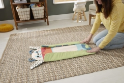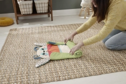 Podloga je izdelana iz tkanine, ki vsebuje 90 % reciklirane plastike, in je dostavljena v embalaži s certifikatom FSC. Zahvaljujoč pametni zasnovi jo preprosto zvijete, pritrdite z “tačkami” in vzamete s seboj na pot. Odstranljive igrače zlahka pripnete na zanke, zato je igra vedno nova in spodbudna.