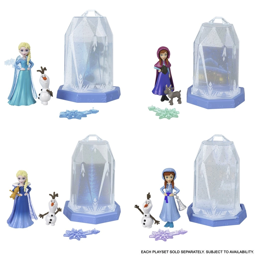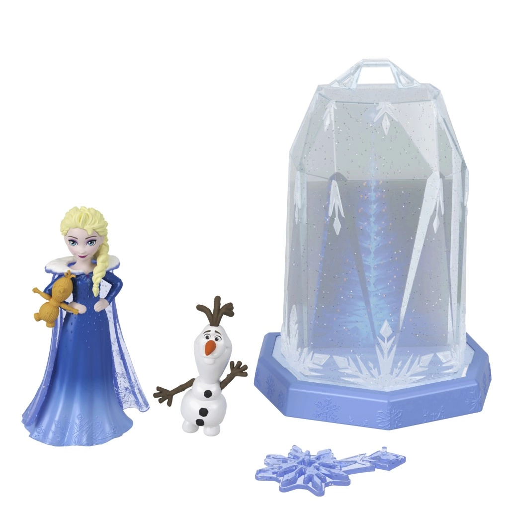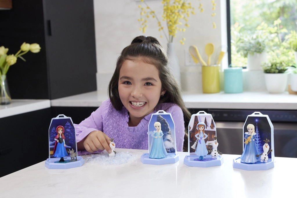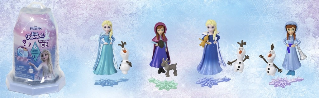 Ta kolekcija malih punčk s presenečenji ponuja inovativen razpakirni doživetje zahvaljujoč Squishy Ice™ – ledeno modri žele podobni zmesi. Otroci se s priloženo lopatico prekopljejo skozi posodico s Squishy Ice™ in odkrijejo zaklade v notranjosti: malo punčko Anno ali Elso, figuro prijatelja in 4 igralne dodatke.