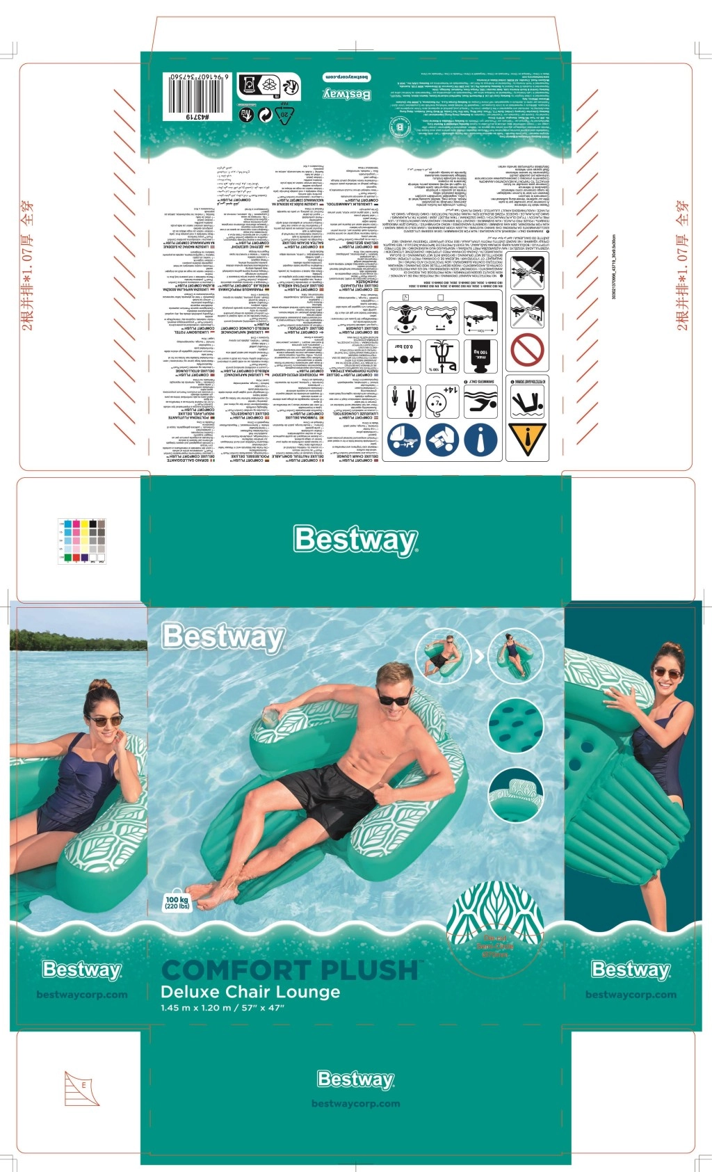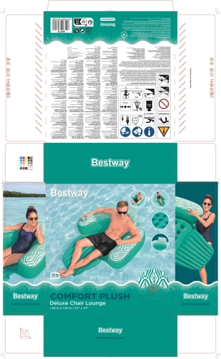 Napihljiv naslanjač Bestway Deluxe Comfort Plus je idealen za bazen, jezero in mirno morje. Ergonomsko naslonjalo z integriranim vzglavnikom podpira hrbet in vrat, medtem ko zložljiv podnožnik omogoča dvig sedeža in izbiro udobnega položaja pri sedenju ali ležanju. Žametno mehka, vodoodporna površina Comfort Plus je prijetna na dotik in v vodi deluje še bolj privlačno.