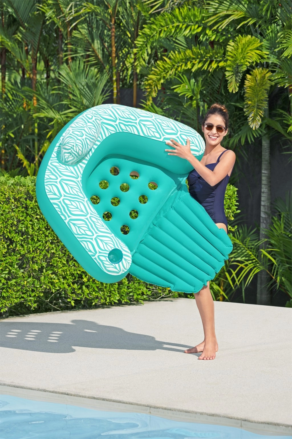 Tri zračne komore in varnostni ventili za stabilno plovnost; vgrajeno držalo za pijačo ohranja osvežitev vedno pri roki.