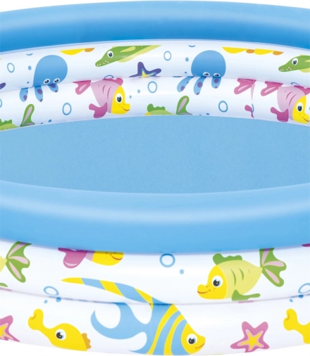 Enostavna namestitev s tremi napenljivimi obroči ponuja preprostost in stabilnost. Bazenček je zasnovan z mislijo na varnost otrok in enostavno vzdrževanje. Del paketa je tudi popravljalna krpica, ki omogoča hitro popravilo v primeru poškodbe.