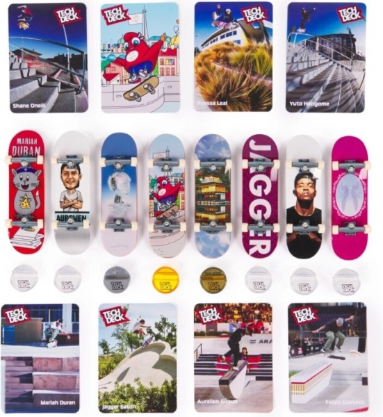 Vsak fingerboard v tej kolekciji ima avtentičen dizajn od svetovno znanih rolkarskih podjetij. Vključuje tudi 8 zbirateljskih kartic, ki prikazujejo izbrane rolkarje pri akrobatskih vragolijah. Postavite svoje fingerboarde na stojala z zlatimi, srebrnimi in bronastimi držali in jih razstavite s ponosom.