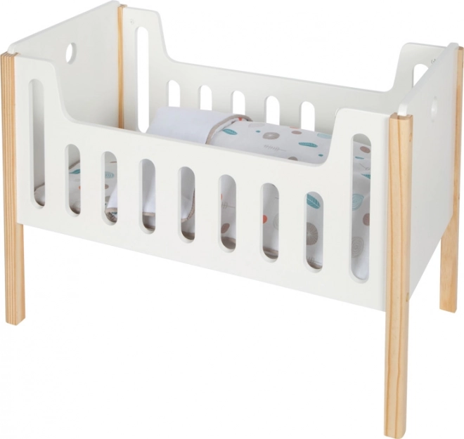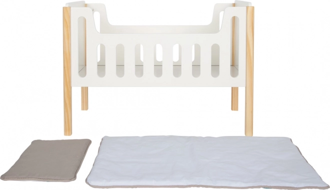 Ta moderna posteljica za punčke, zasnovana v skandinavskem linearnem dizajnu, je popolna izbira za uspavanje punčk ali plišastih igrač. Visokokakovostna izdelava vključuje zaobljene robove in masivne lesene elemente za večjo vzdržljivost in varnost. Priložena je obojestranska posteljnina z veliko odejo, ki zagotavlja udoben spanec tudi za večje punčke. Povišana ležalna površina za punčke nudi ergonomsko igralno izkušnjo.