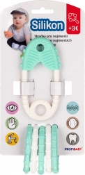 Silikonski grizalo Sponka z obeski je zasnovano za nežno masažo dlesni in pomiritev med izraščanjem zobkov. Kombinacija trpežne plastike in mehkega silikona zagotavlja prijeten dotik in varno uporabo že od rojstva.