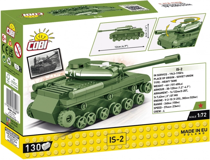 Tank IS-2, naslednik težkih sovjetskih strojev iz leta 1943, je zaslovel z 122‑mm topom, ki je bil sposoben prebiti oklepe TIGROV in PANTER. Ta kompaktni komplet v merilu 1:72 zvesto povzema značilne lastnosti izvirnika – vključno z vrtljivo kupolo, premično cevjo in avtentičnimi potiski z belimi črtami iz bitke za Berlin.