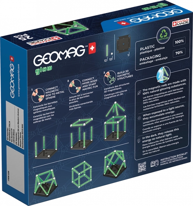V temi svetleča magnetna sestavljanka ti prinaša novo dimenzijo zabave. Sestavljanka iz 100 % reciklirane plastike se v temi vsekakor ne bo izgubila! Paket vsebuje skupaj 25 kosov – 12 svetlečih palčk, 12 kroglic in eno stabilno črno osnovo v obliki kvadrata. Primerno za otroke od 3 let dalje.
