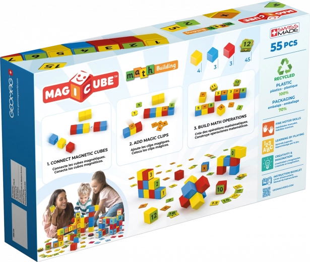 Odkrijte zabavno učenje z magnetnimi kockami Geomag Magicube, ki se privlačijo z vseh šestih strani in omogočajo ustvarjanje 3D kombinacij. Set vsebuje 10 magnetnih kock iz 100 % reciklirane plastike in 45 obojestranskih sponk s številkami in matematičnimi simboli. Barvno razlikovanje sodih in lihih števil ter operacij olajša orientacijo. Podpira fino motoriko, ustvarjalnost in igrivo učenje matematike. Primerno od 3 let, izdelano v Švici.