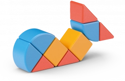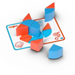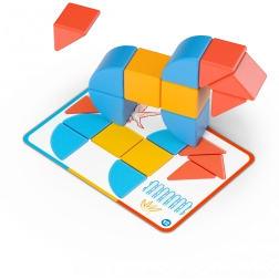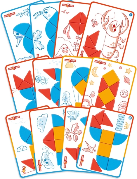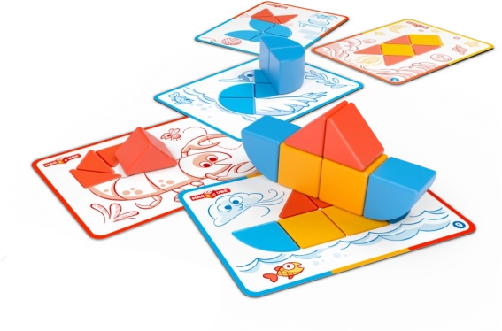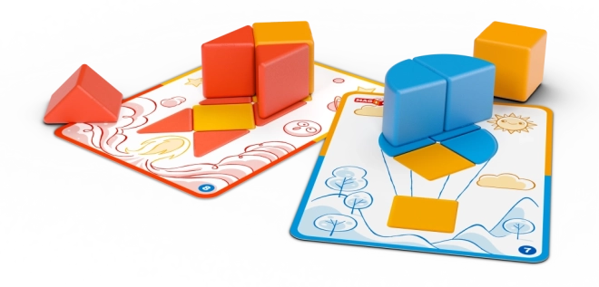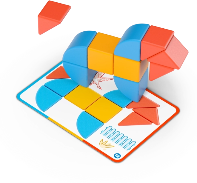 V kompletu je 6 dvostranskih kartic z 12 nalogami, ki vodijo od preprostih sestavljank do naprednejših oblik ter spodbujajo logično razmišljanje.