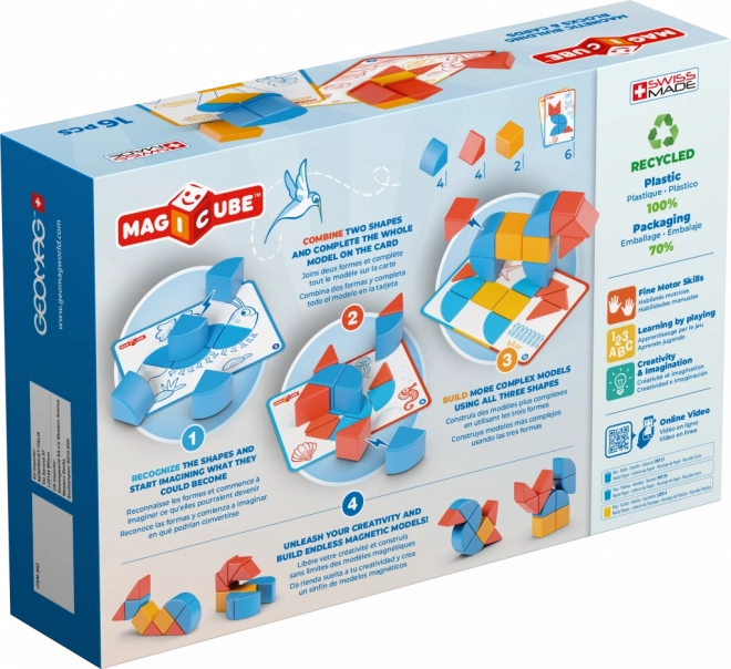 Geomag Magicube Shapes otrokom na igriv način približa spoznavanje oblik in konstrukcije. Zaradi pametne magnetne tehnologije se kosi privlačijo z različnih strani, zato je sestavljanje intuitivno, zabavno in spodbudno za nadaljnje odkrivanje. Del pakiranja so tudi dvostranske kartice z idejami, ki korak za korakom vodijo od enostavnih slik do zahtevnejših projektov.