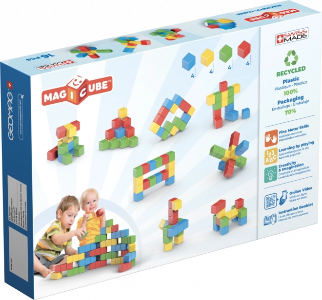 Gradnja je varna, zabavna in brez zaslonov. Kocke so trpežne, prijetne na otip in se zahvaljujoč magnetom trdno držijo skupaj. Set s 16 kosi je odličen začetek v svetu magnetnih gradbenih kompletov in ga je mogoče preprosto razširiti z dodatnimi seti GEOMAG.