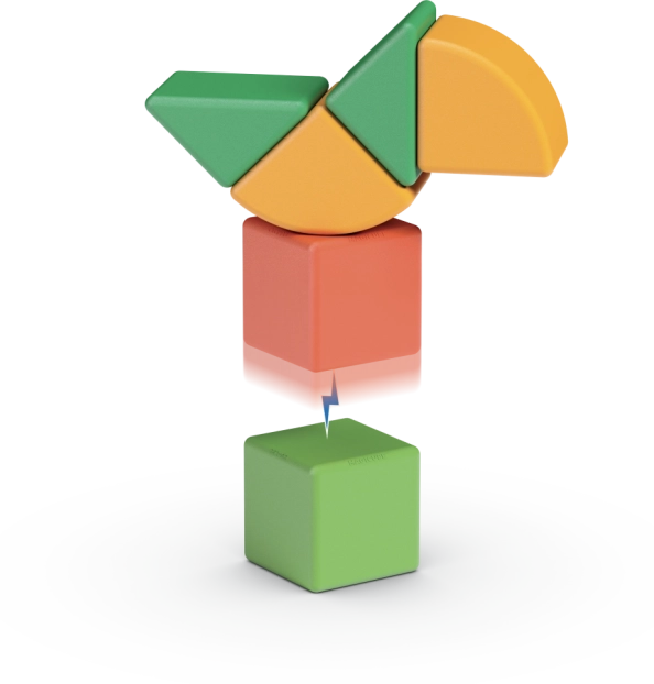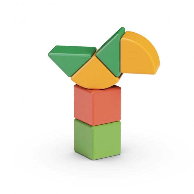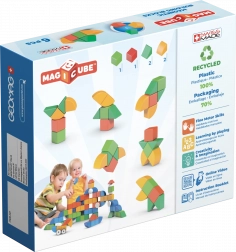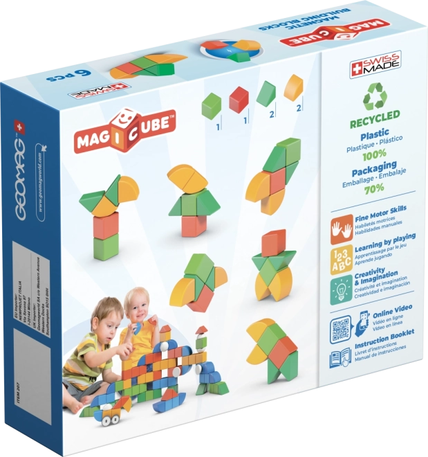 Set vsebuje 6 kosov – poleg klasičnih magnetnih kock tudi druge oblike, ki razširjajo možnosti gradnje. Materiali so trpežni in varni, barvna izvedba je privlačna in spodbuja domišljijo. Sestavljanka je idealen prvi korak v svet STEM iger.