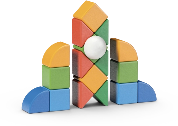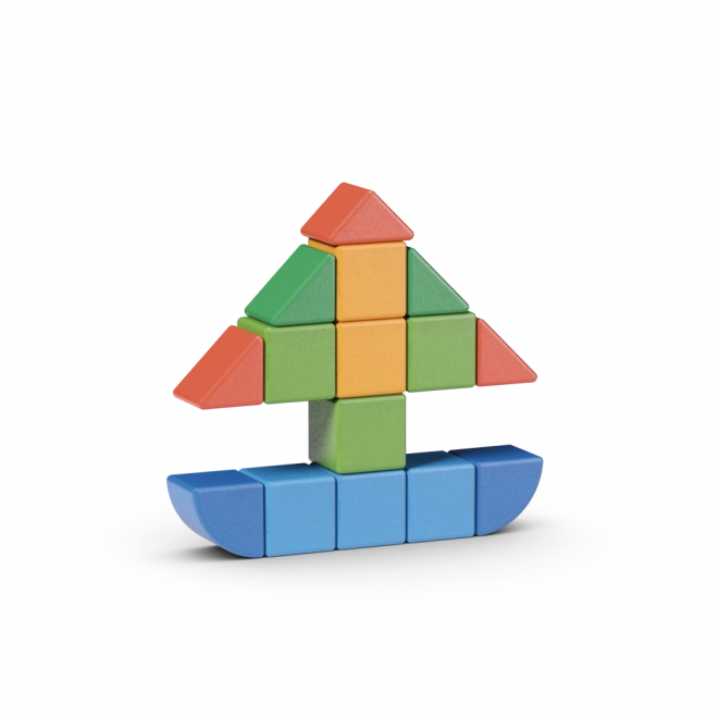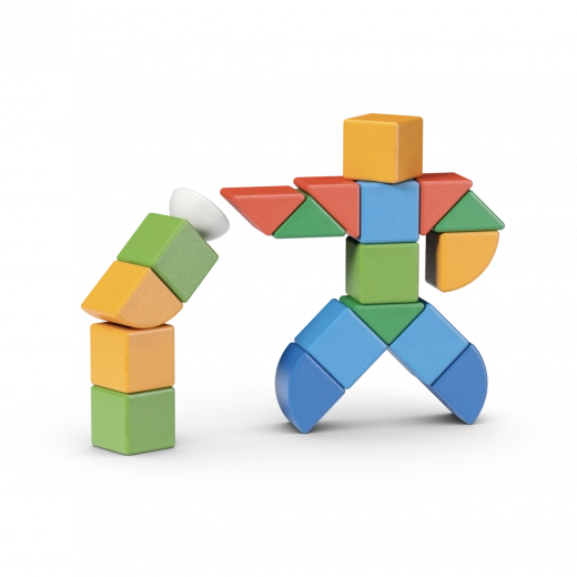 Veliki, barviti deli z zaobljenimi robovi so zasnovani za male roke. Spodbujajo fino motoriko, koordinacijo oko–roka ter razvoj domišljije.
