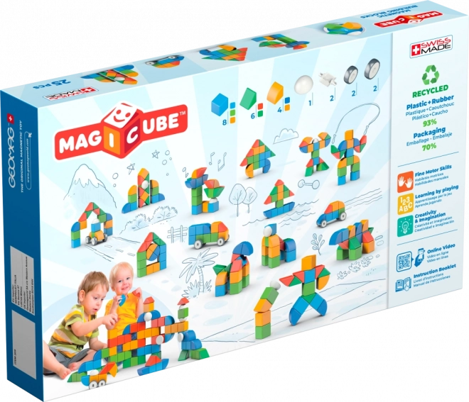 Odkrijte zabavno magnetno sestavljanko GEOMAG MAGICUBE SHAPES s skupno 25 kosi, ki spodbuja otroško ustvarjalnost že od 1. leta dalje. Set združuje klasične magnetne kocke z dodatnimi oblikami in magnetnimi kolesci za ustvarjanje vozil, živalic in zgradb. Zaradi varne zasnove, živahnih barv in preprostega spajanja bodo otroci uživali v dolgih urah kreativne igre brez zaslonov.