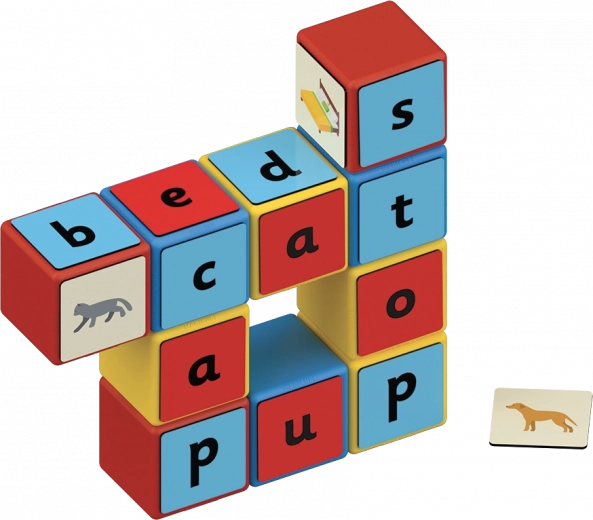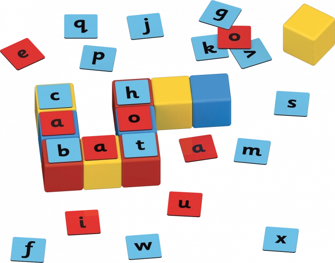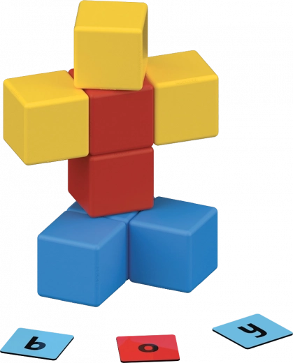 V kompletu je 10 magnetnih kock iz 100 % reciklirane plastike in 45 dvostranskih sponk s črkami in slikami. Sponke barvno ločujejo samoglasnike in soglasnike, kar olajša prve korake pri branju in sestavljanju besed. Igra razvija kreativnost, fino motoriko, logično mišljenje in spodbuja radovednost pri odkrivanju magnetizma.