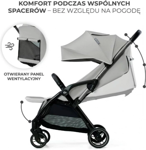 Športni voziček KINDERKRAFT Apino je zasnovan za vsakodnevno udobje staršev in otrok od rojstva do približno 4 let. Zahvaljujoč sistemu AUTO FOLDING se sam zloži tudi s sedežem in v zloženem stanju samostojno stoji. Nizka teža 7,5 kg in ozek profil ga naredita idealnega spremljevalca za javni prevoz, dvigala in stopnice.