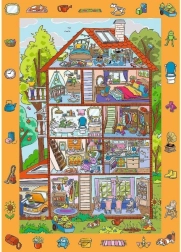 Sestavljanka z motivom »V hiši« prinaša edinstveno kombinacijo sestavljanja in iskalne igre. Otroci najprej sestavijo veliko, barvito sliko, nato pa v njej iščejo skrite elemente, prikazane ob straneh okvirja. Zabava se tako ne konča z zadnjim koščkom.