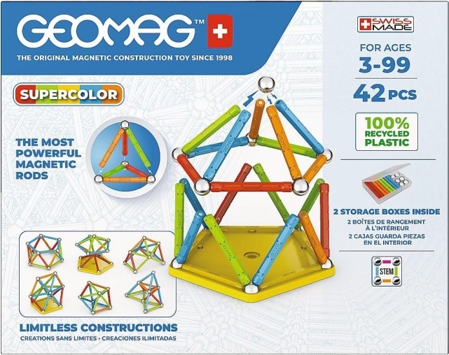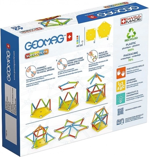 Odkrijte ustvarjalni svet z magnetno sestavljanko GEOMAG Supercolor Panels Recycled z 42 kosi. Močni magneti, barvni paneli in kovinske kroglice omogočajo gradnjo raznolikih 2D in 3D konstrukcij ter razvijajo fino motoriko, prostorsko predstavljivost in kreativnost. Izdelano iz 100 % reciklirane plastike – zabava, prijazna do planeta.