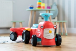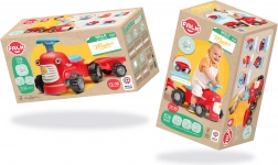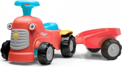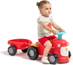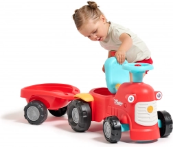 Ta rdeč otroški poganjalec v obliki traktorja z odstranljivo prikolico je idealno prvo vozilo za malčke. Zahvaljujoč stabilni konstrukciji in največji nosilnosti 25 kg je vožnja varna in udobna. Vrtljiva sprednja prema olajša zavijanje, medtem ko hupa na krmilu doda še več zabave pri vsaki vožnji.