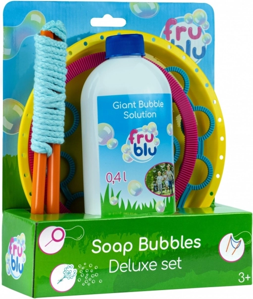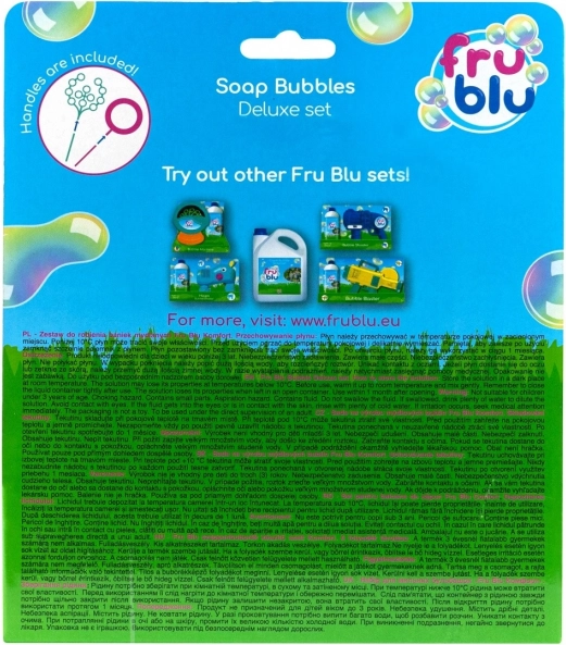 Deluxe komplet za mehurčke FRU BLU z raztopino 0,4 l prinaša kompaktno, enostavno shranljivo rešitev za ustvarjanje majhnih in tudi orjaških mehurčkov. Zahvaljujoč enostavnemu sestavljanju, 3 zamenljivim nastavkom in priloženi raztopini 0,4 l bodo otroci in odrasli uživali v maksimalni zabavi na prostem na praznovanjih in vsak dan.