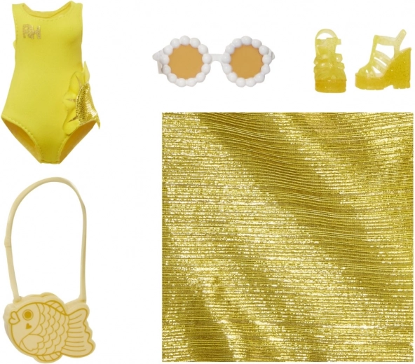 Vključuje modne dodatke, kot so plavalna obleka, sončna očala in torbica v obliki ribe.