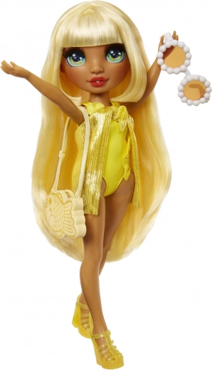 Lutka je pripravljena za dan poln zabave s svojim stilnim kostumom, ki vključuje usklajene sandale in sončna očala. Popolna za plažo, ob bazenu ali v kopalni kadi - kjerkoli vam domišljija dovoli.
