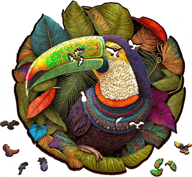 Vsak košček je natančno lasersko izrezan za popolno prileganje in gladkost. Sestavljanka prikazuje čudovit motiv tukana, natisnjen s pomočjo moderne tehnologije UV digitalnega tiska, ki prinaša resnično žive in realistične barve.