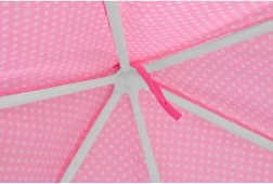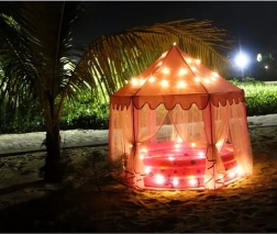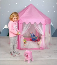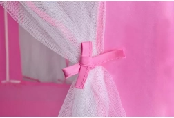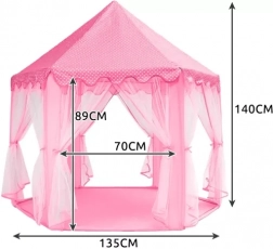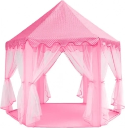 Ta roza otroški šotor ustvarja prijetno 'palačo', kjer se razvija otroška domišljija. Šesterokotna osnova nudi dovolj prostora za blazine, plišaste igrače in knjige, medtem ko prosojne zavesice iz mrežice na šestih vhodih ustvarjajo občutek zasebnosti in hkrati zagotavljajo odlično kroženje zraka. Šotor je primeren za igro za do 2 otroka pod nadzorom odraslih.