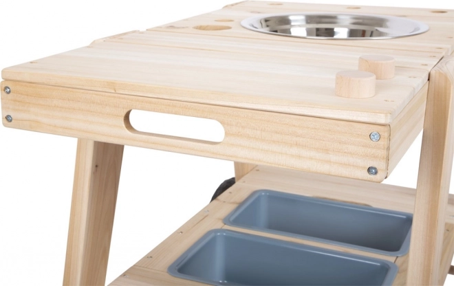 Zaradi robustnih koles kuhinjico zlahka premaknete med vrtom, teraso ali balkonom. Trdne lesene noge zagotavljajo stabilnost med igro.