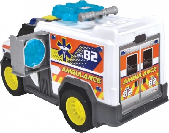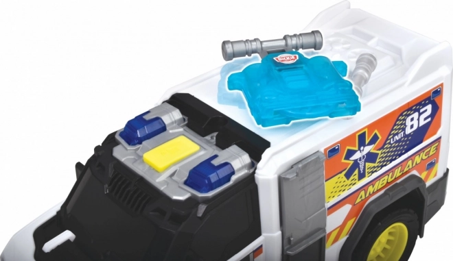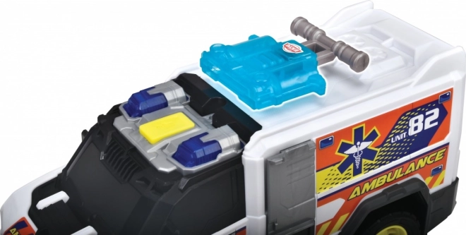 Reševalno vozilo dolžine 30 cm znamke Dickie Toys je opremljeno z več odličnimi funkcijami, ki zagotavljajo nepozabne trenutke: