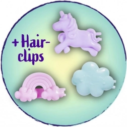 Evi ima dolge rožnate lase in barvne sponke v obliki oblačka, mavrice in samoroga za neskončno ustvarjanje pričesk.