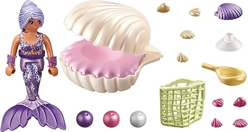 Set vsebuje figuro vile, veliko školjko, škatlico za školjke, prijemalo za bisere, mrežico in drobne dodatke – vse za neskončne podvodne pustolovščine.