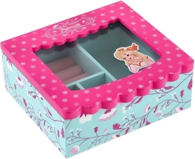 Ta dekorativna škatlica za nakit iz kakovostnega lesa je odlična rešitev za pregledno shranjevanje prstanov, uhanov in drobnih zakladov. Rožnat pokrov s steklenim/transparentnim delom in notranjim ogledalcem olajša hiter izbor dodatkov, medtem ko turkizno dno z nežnim cvetličnim vzorcem doda prostoru čaroben poudarek.