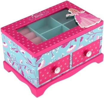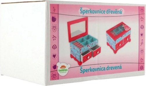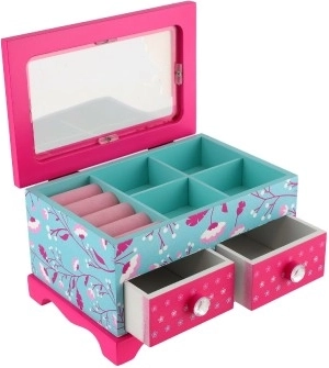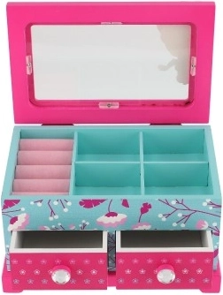 Zgornji del z ogledalcem in razdeljenimi predalčki ter dva prostorna predala poskrbita, da so nakit in drobnarije pregledno na svojem mestu.