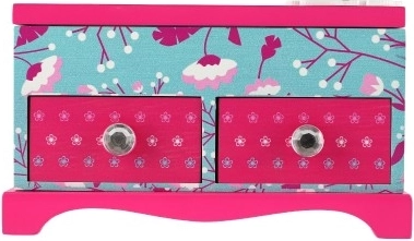 Površino škatlice krasijo nežni cvetlični in ptičji motivi v kombinaciji rožnate in turkizno modre barve, ki lepo dopolnijo vsako otroško sobo. Zaradi trdne lesene izdelave in gladkih ročajev je rokovanje zanjo za otroke udobno. Ni igrača – primerno kot dekorativen in shranjevalni predmet.