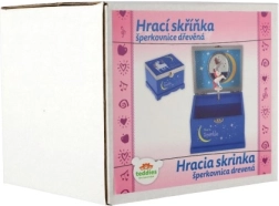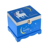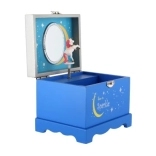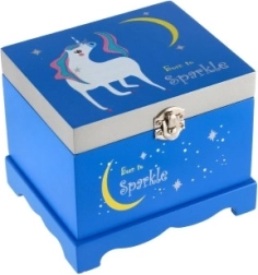 Čarobna glasbena škatlica za nakit za male navdušenke v elegantni modri barvi. V notranjosti najdete ogledalce in vrtečega se samoroga, ki po navijanju zaigra melodijo. Lesena izvedba, varno shranjevanje nakita in zakladkov ter igriv dizajn z zvezdami in lunico jo naredijo idealni dodatek otroški sobi.