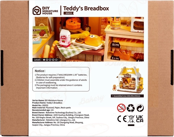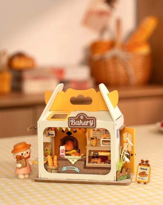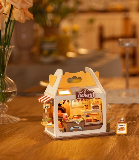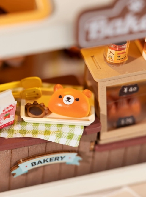 Medvedkova pekarna je očarljiva miniatura za vse, ki imajo radi ustvarjanje in dizajn. Komplet vsebuje vse potrebno za sestavo, vključno z lepilom in orodji, dodati je treba le škarje. Po vklopu LED osvetlitve se pekarna spremeni v toplo, prijetno svetilko, ki poudari vsak detajl vitrin, napisov in pekovskih dobrot.