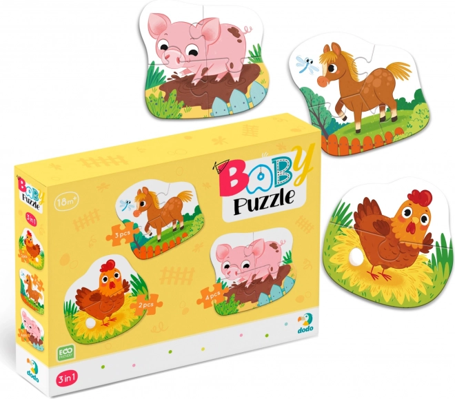 Ta komplet baby puzzlov je idealna izbira za prvo spoznavanje otrok s sestavljankami. Tri samostojne obrisne slike živalic s kmetije imajo različno število koščkov (2, 3 in 4), zato se lahko otrok postopoma izboljšuje in doživlja veselje ob uspehu pri vsaki sestavljeni sliki.