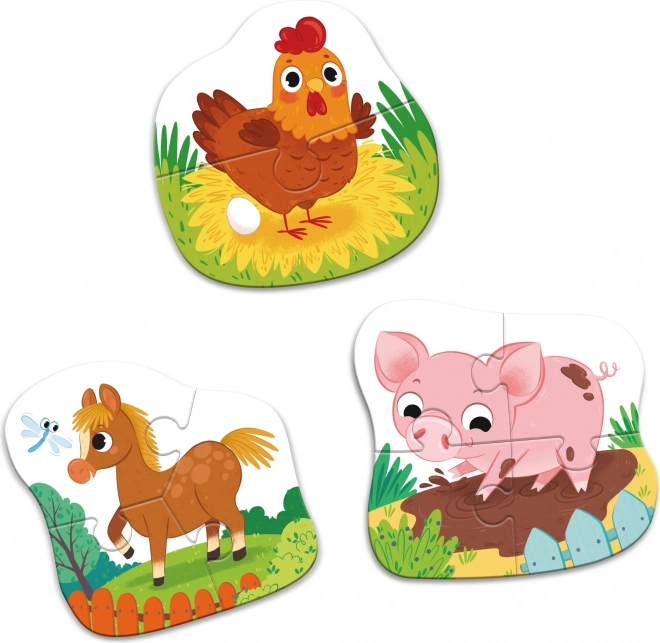 Odkrijte prve korake v sestavljanju za najmlajše: baby puzzle s tremi obrisnimi slikami živalic s kmetije v težavnostih 2, 3 in 4 koščki. Zahvaljujoč preprostim oblikam in prisrčnim ilustracijam podpirajo otroke pri prvih korakih sestavljanja, razvijajo domišljijo, logično mišljenje, fino motoriko in koordinacijo oko–roka.