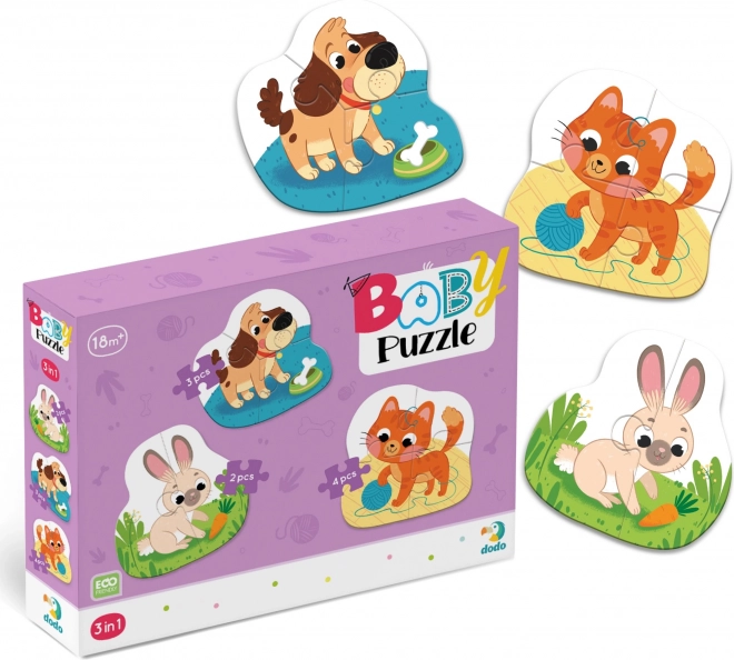 Odkrijte prve sestavljanke za najmlajše: set DODO baby puzzle hišni ljubljenčki 3v1 ponuja tri obrisne slike z različno zahtevnostjo (2, 3 in 4 kosi). Odlično za razvoj fine motorike, logičnega razmišljanja in koordinacije oko–roka, hkrati pa prinaša veselje z ljubkimi motivi hišnih ljubljenčkov.