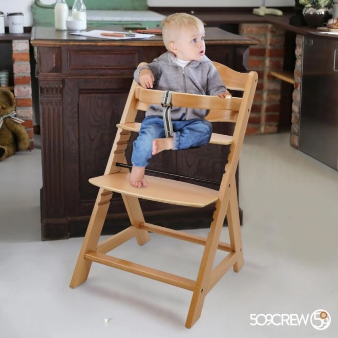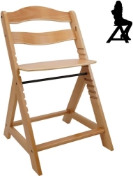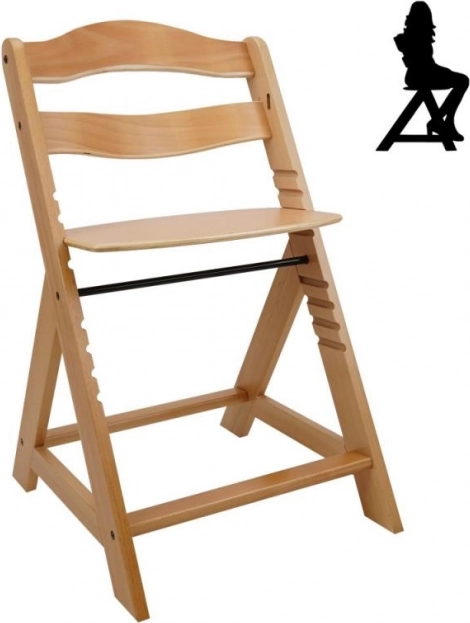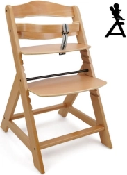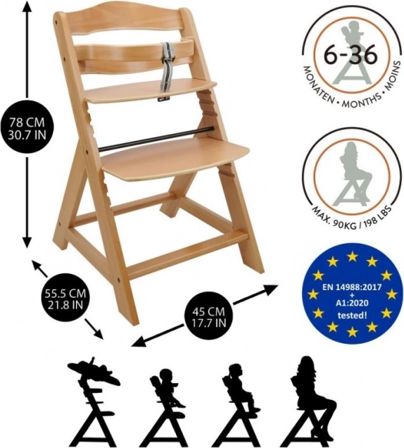 Leseni otroški visok stol je zasnovan za maksimalno udobje in varnost otrok od šestih mesecev. Opremljen je z večstopenjsko nastavitvijo višine sedeža in nožnega opornega, zato je koristen od zgodnjega otroštva do odraslosti. Ko otrok doseže višjo starost, se sprednja lestev in pregradna pregrada lahko odstranita, stol pa preoblikuje v normalen stol. Izdelan je iz visokokakovostnega nemškega bukovega lesa, ki zagotavlja stabilnost in eleganco. Njegova maksimalna nosilnost je do 90 kg.
