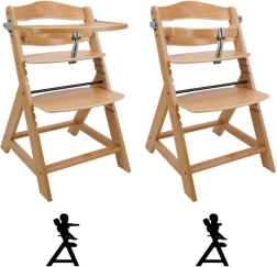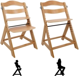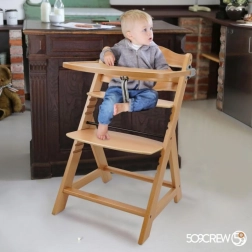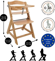 Lesen visok stolček, ki raste skupaj z otrokom. Vključuje lesen sprednji pladenj, sprednjo prečko in delilnik za mednožje – pri starejših otrocih ga je mogoče odstraniti in predelati v običajen stol tudi za odrasle. Večstopenjska nastavitev višine sedeža in opore za noge. Opora za noge je lahko popolnoma odstranljiva.