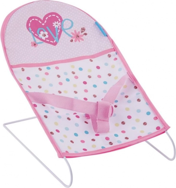Gugalnik s kovinskim okvirjem ponuja udoben sedež za punčko med igro. Opremljen je z varnostnim pasom in potiskom s srčki in rožami.